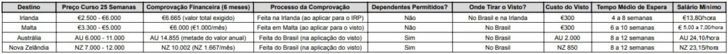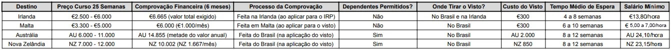Para te ajudar, preparamos uma tabela comparativa com as principais informações sobre cada destino. Consideramos cursos de 25 semanas, pois essa é a duração mínima que garante estudar e trabalhar em qualquer um deles.